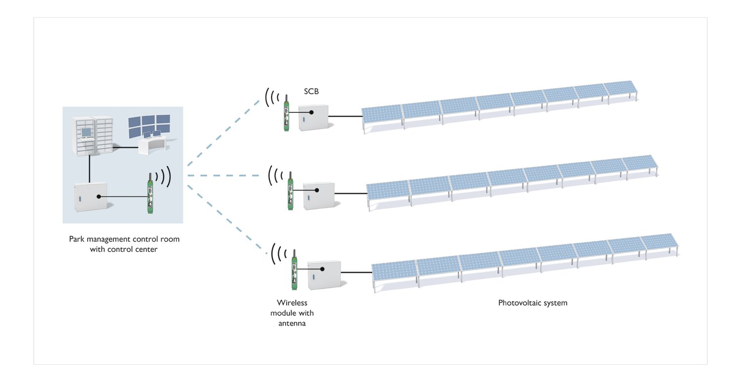 汇流箱数据可以通过串行RS-485接口输出,并无线传输到发电站中央管理系统。菲尼克斯电气无线技术十分成熟,能够实现距离长达500 m的无干扰可靠通信,支持至多250个汇流箱。无线系统支持网状网络的搭建,因此设备之间可通过中继器和服务器站点相互通信。
